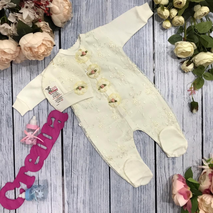 Комплект из 2 предметов, комбинезон + шапка, украшен нежным кружевом