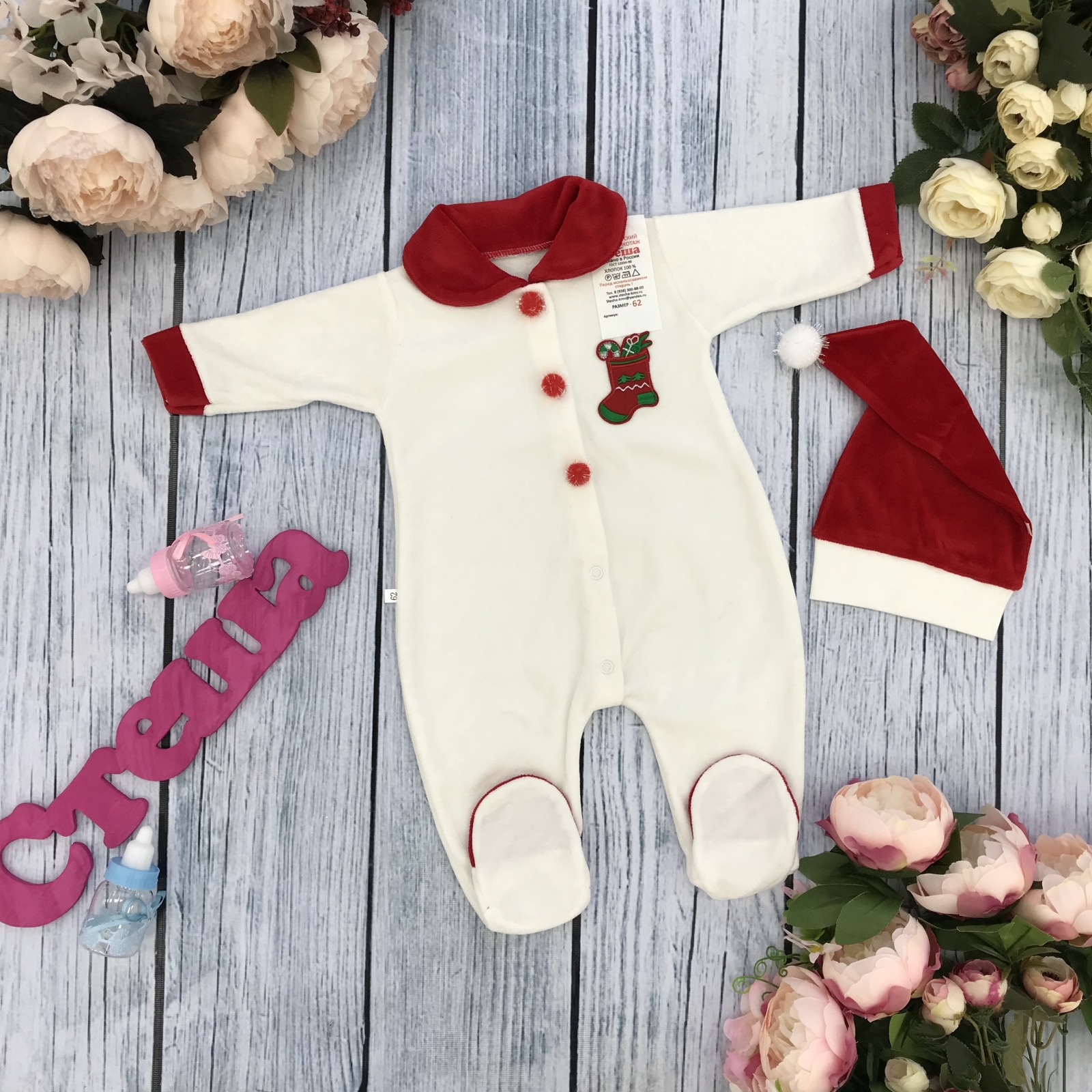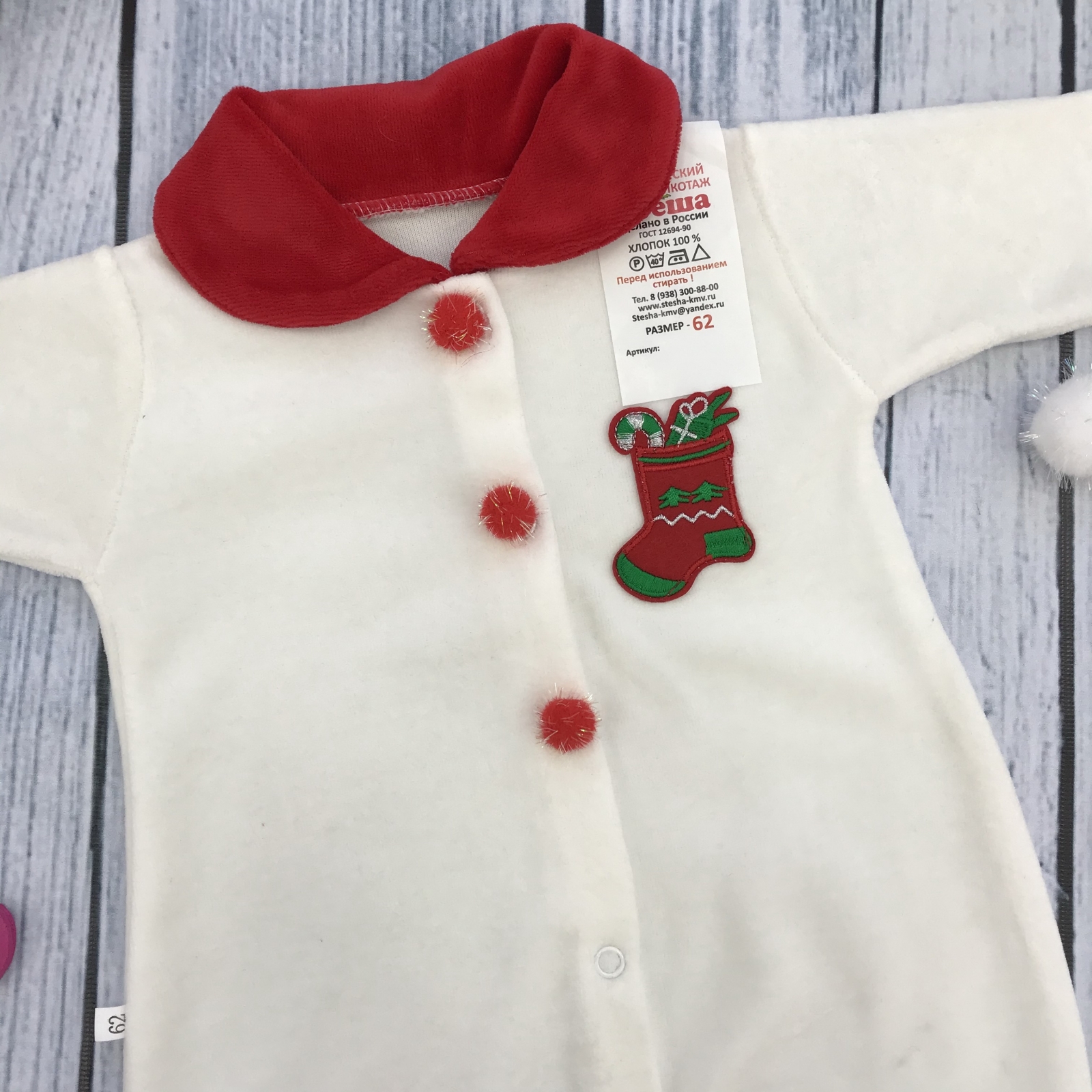 Теги: Купить оптом новогодний комбинезон от производителя. 244. Комбинезон Санта, хлопок 80% велюр 20% ПЭ, молочный 56,62,68 цена,отзывы официальный сайт "Стеша Златоуст"