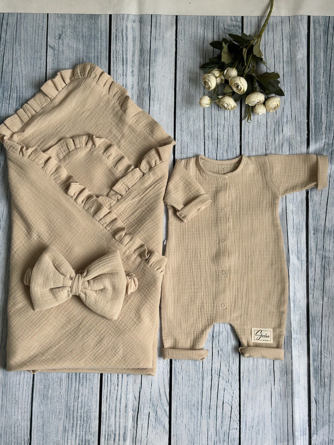 Теги: Купить детские конверты, комбинезон оптом, детские конверты на выписку оптом. 335-К. Комплект из детского комбинезона, р 56 и конверта муслин, хлопок 100% 90/90 см, кофейный цена,отзывы официальный сайт "Стеша Златоуст"