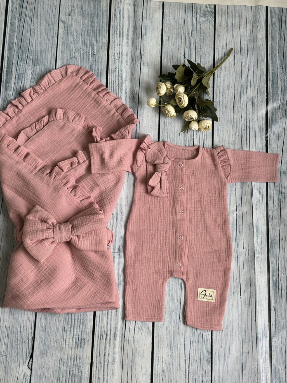 Теги: Купить детские конверты, комбинезон оптом, детские конверты на выписку оптом. 335-П. Комплект из детского комбинезона, р 56 и конверта муслин, хлопок 100% 90/90 см, пудра цена,отзывы официальный сайт "Стеша Златоуст"